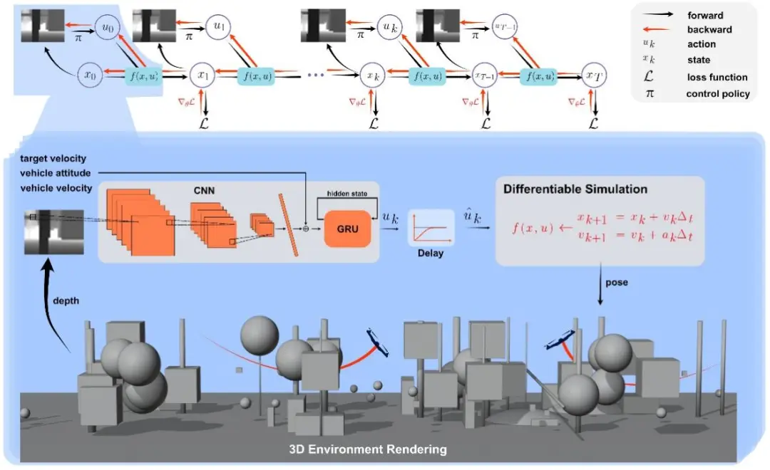 End-to-end differentiable simulation training: The policy network directly controls the drone's motion, and backpropagation is implemented through a physical simulator.