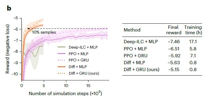 Figure 5: This research method surpasses the existing method (PPO+GRU) with 10% of the training data, and its convergence performance is much higher than the existing method.